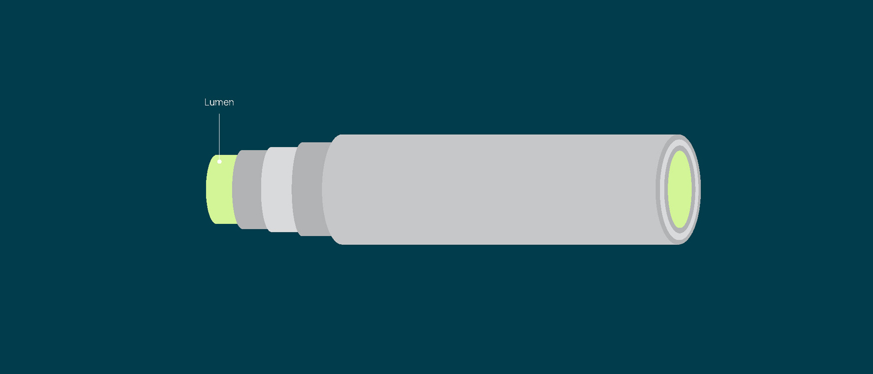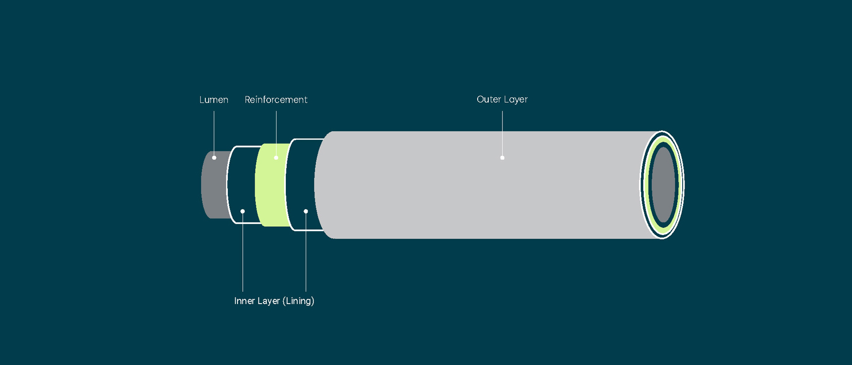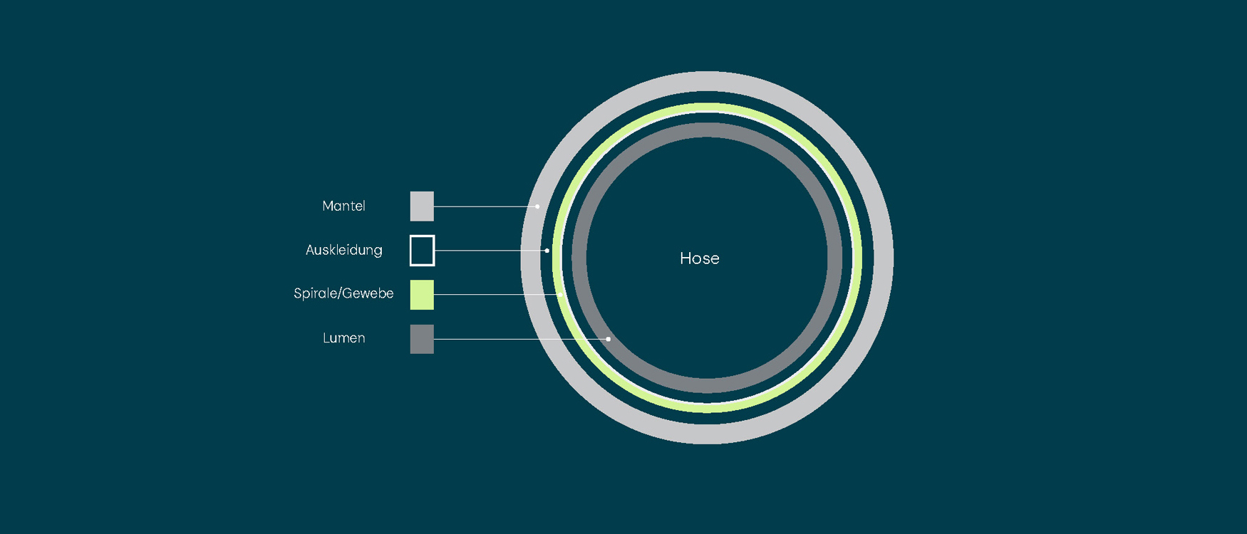 A hose consists of four main components: the lumen, the lining, the spiral and the cover. Each of these four layers fulfils its own function and is essential for the overall functionality of the tubing system.